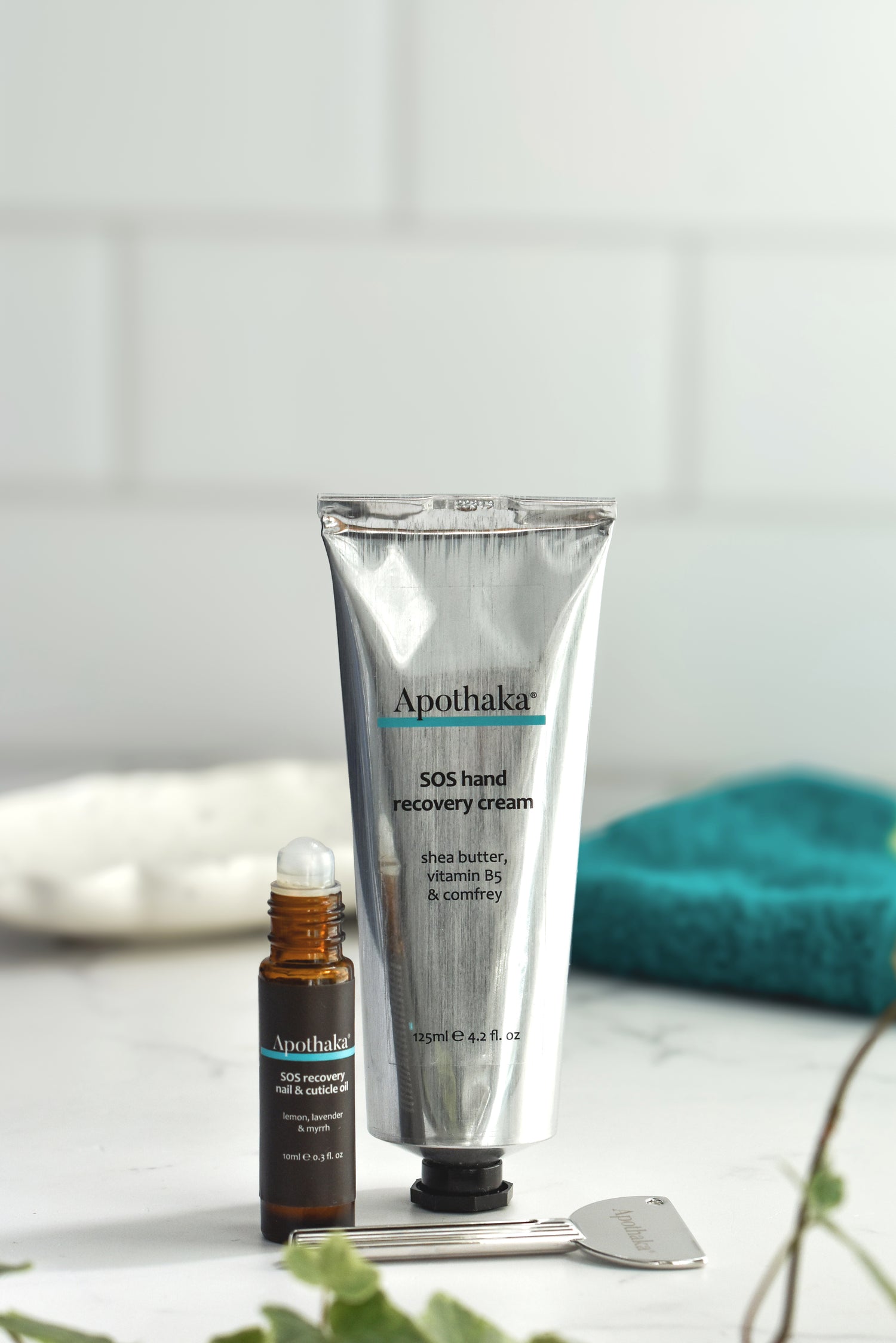SOS recovery hand care duo £40: a pampering gift for the hand care lover, featuring Apothaka®'s best selling nourishing and beautifully fragranced SOS recovery hand cream with tube squeezer key plus a handbag friendly SOS recovery nail & cuticle oil rollette bottle.