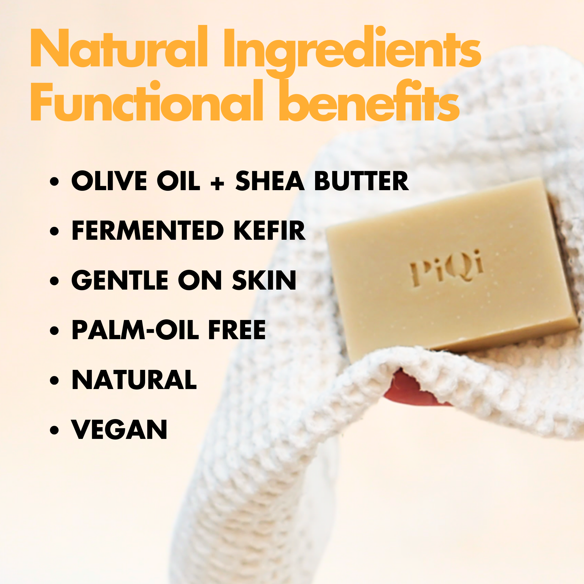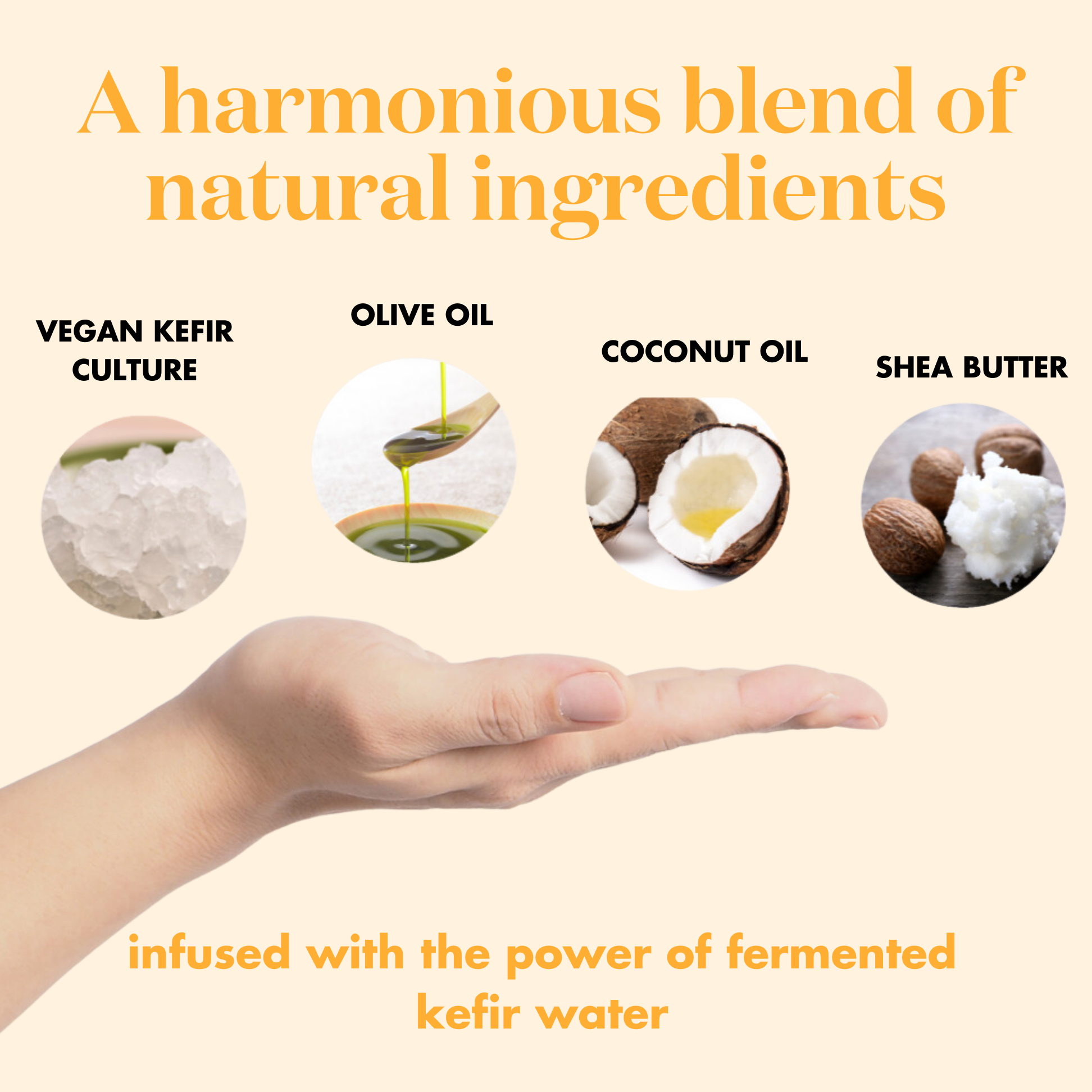 Ingredients: Sodium Olivate, Sodium Cocoate, Sodium Shea Butterate, Sodium Castorate, Kefir Water (Aqua, Ficus Carica Fruit Extract, Sucrose, Vinegar, Kefir Culture), Glycerin, Citrus Aurantium Dulcis Peel Oil, Cinnamomum Zeylanicum Leaf Oil